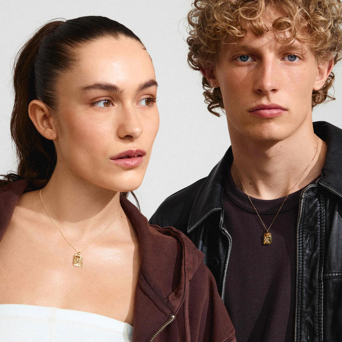 Aquarius. The stars shine within you! With the Aquarius Zodiac Sign Necklace from Pilgrim, show off a piece as unique as you are. Gold-plated chain and double-sided square pendant: on one side, the classic Aquarius symbol, on the other, your constellation in Preciosa crystals! This rustic, handmade pendant offers a bold and universal style, perfect as a personal statement or meaningful gift. The necklace measures 40 cm with a 12 cm extension and is made from 98% recycled materials.
