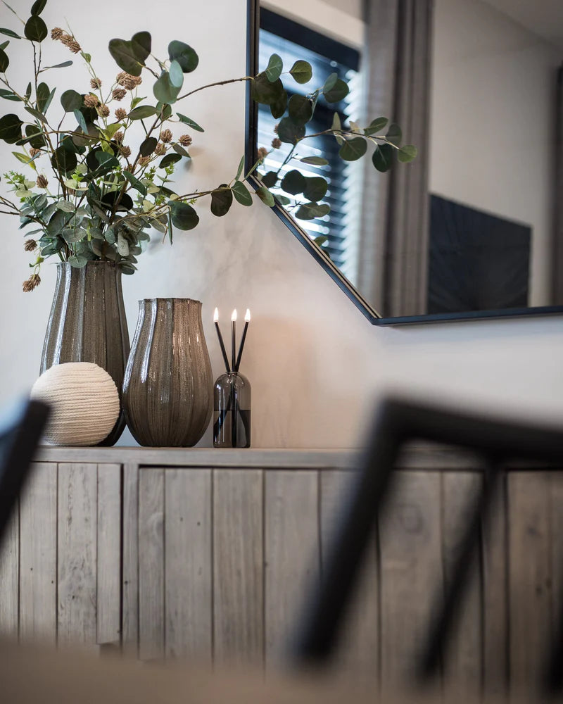 A translucent smoky gray vase that brings a subtle touch of mood to any interior decor.