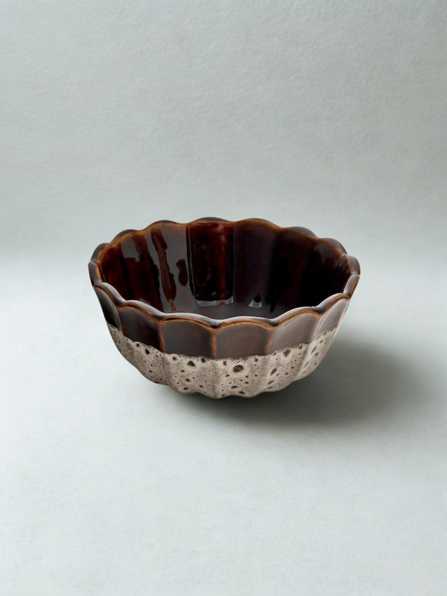 Ce bol en argile à bord festonné se distingue par sa forme organique et son fini bicolore brun et blanc, qui évoque le travail artisanal et les matières brutes. Son design texturé en fait une pièce d’accent idéale pour rehausser une table basse, une étagère ou un plateau décoratif.