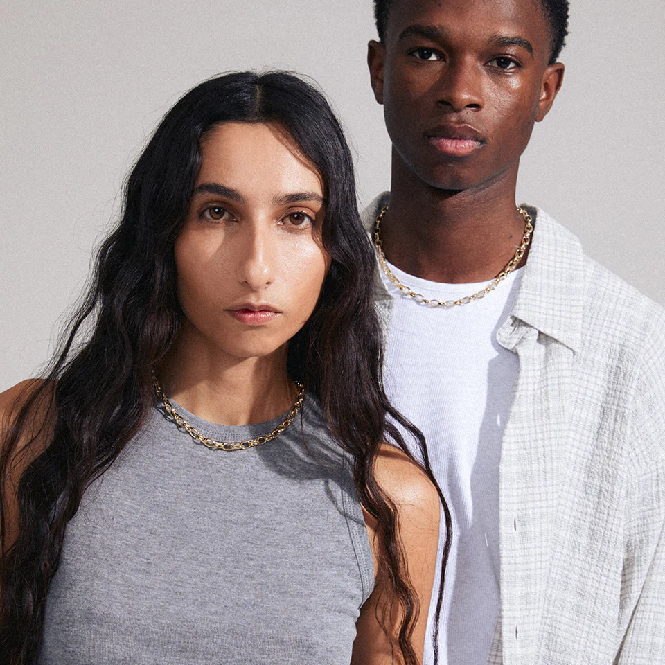 Chaîne en câble plaqué or, de 50 cm, avec fermoir décoratif en T ajustable. Design fluide et audacieux, parfait pour ajouter des breloques ou porter comme une élégante chaîne en Y. Fabriquée à partir d'au moins 75% de matériaux recyclés, elle allie style et respect de l'environnement.