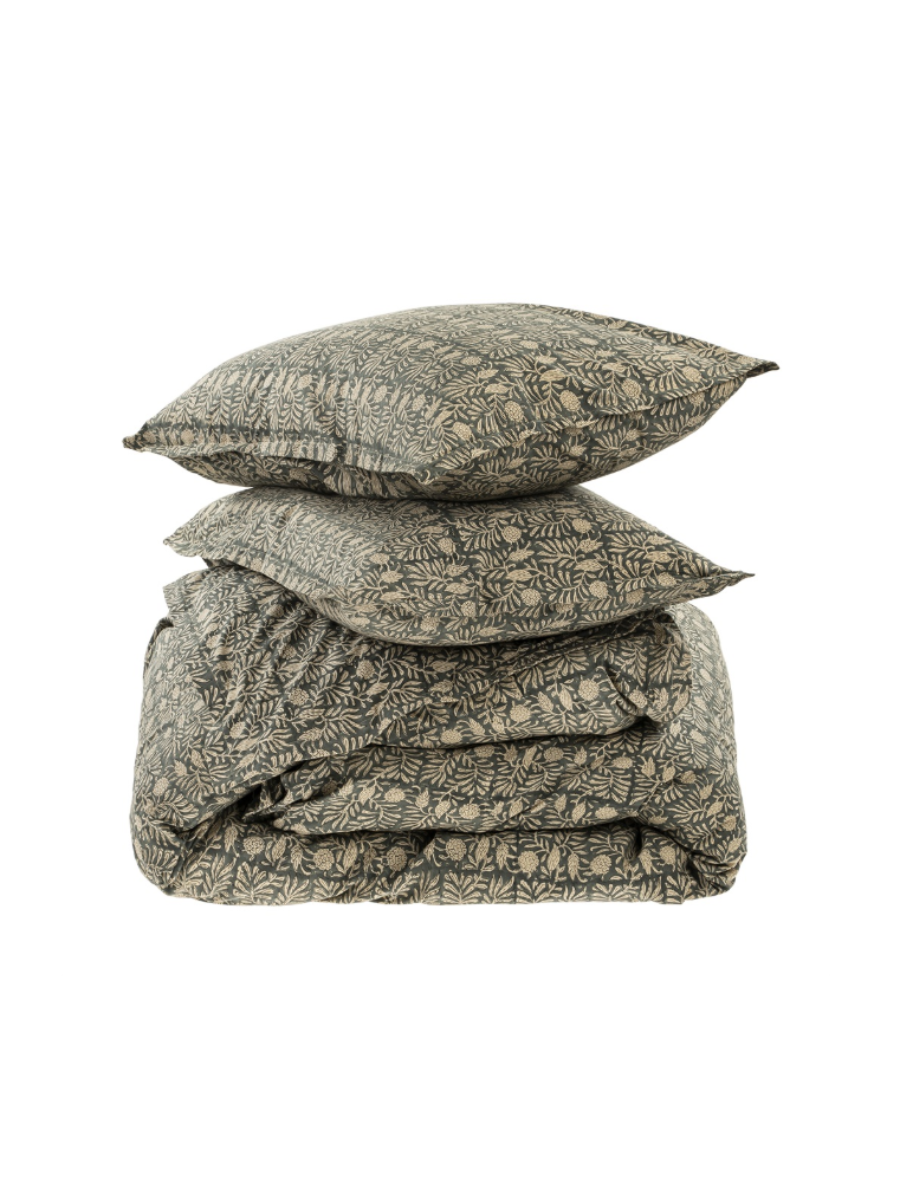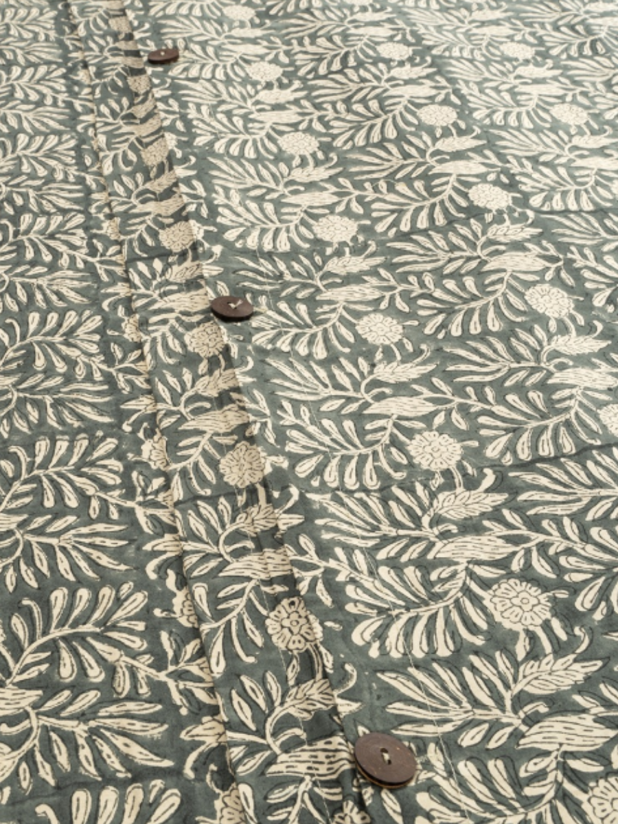 Motif botanique bleu imprimé à la main sur coton biologique. Douce, respirante et apaisante, cette housse artisanale ajoute une touche sereine à la chambre.