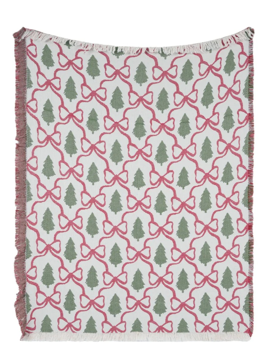 Transformez votre salon en forêt enchantée avec ce jeté festif aux motifs de sapins verts et de boucles rouges. Orné de délicates franges sur les quatre côtés, il est parfait pour créer une atmosphère conviviale et magique, propice aux moments cocooning en famille.