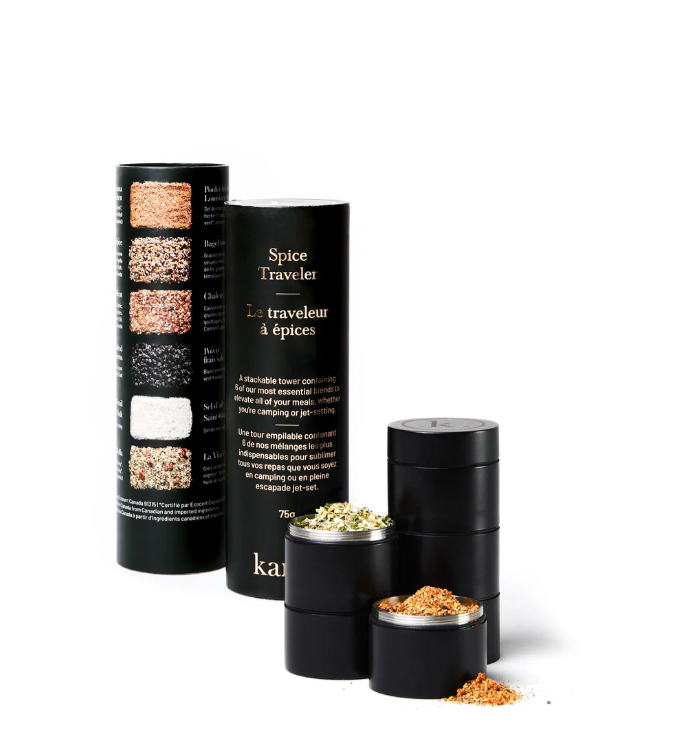 Sublimez vos repas où que vous soyez dans le monde! Notre Traveleur à épices contient 6 compartiments hermétiques remplis de certains de nos mélanges les plus vendus. Lorsque vous les aurez utilisés, vous pourrez les remplir avec vos mélanges favoris. Cet élégant contenant est conçu pour être durable et est parfait pour le camping ou les week-ends au chalet. Mais il a aussi fière allure, alors vous adorerez le glisser dans votre sac à main ou le trimballer en voyage.