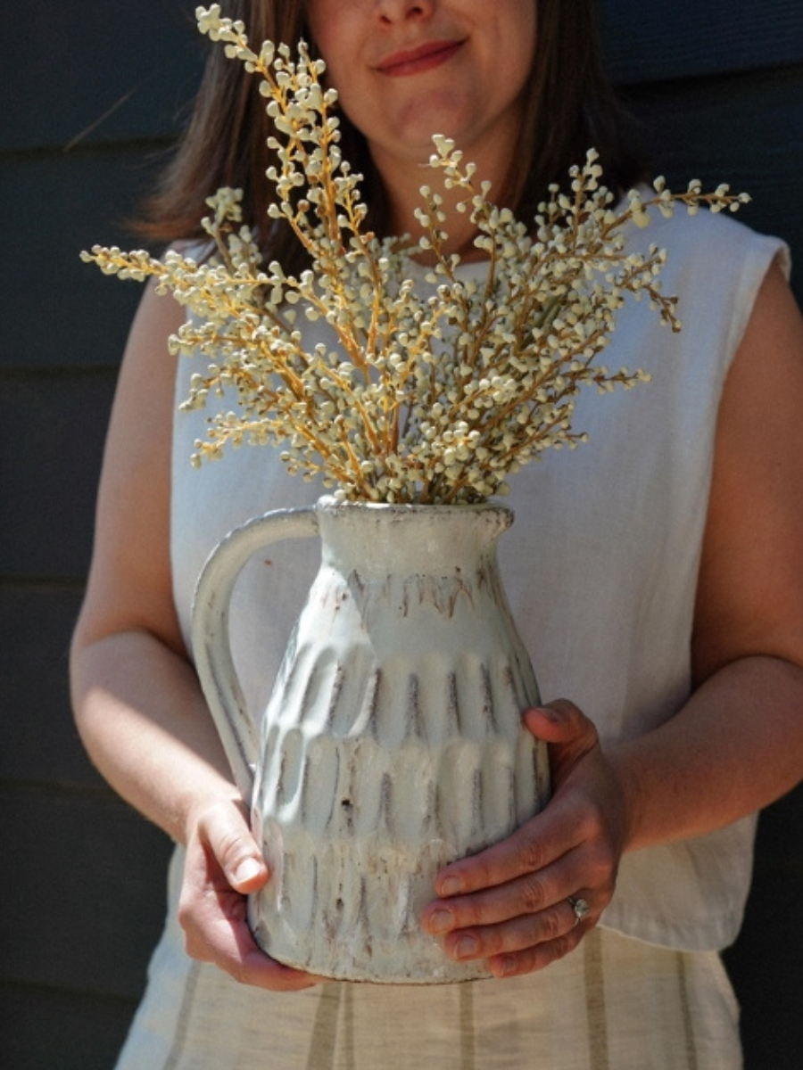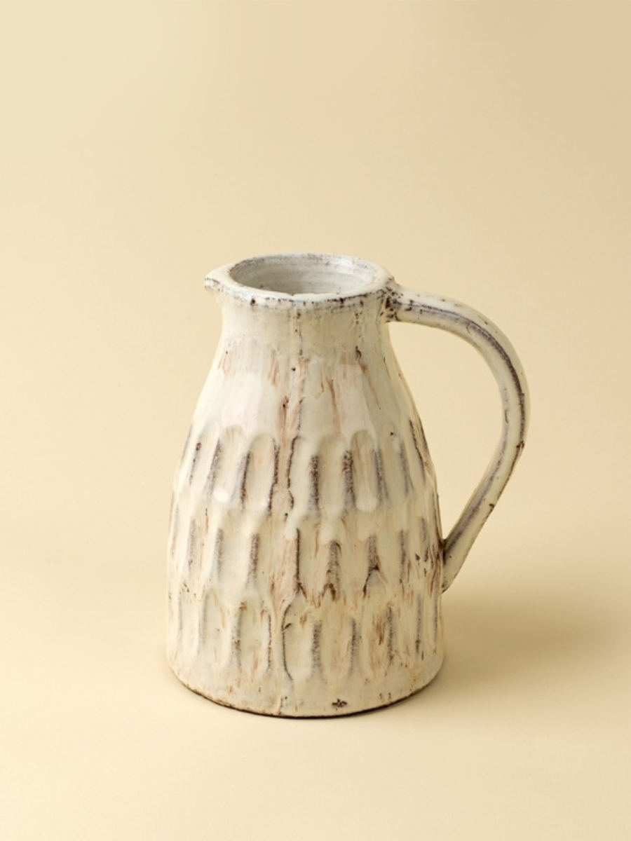 Le pichet décoratif Padme apporte une touche authentique et intemporelle à ton décor. Façonné à la main en terre cuite, il est recouvert d’un émail crème lustré qui laisse subtilement transparaître la chaleur naturelle du matériau. Ses rainures sculptées verticales et sa poignée généreuse lui confèrent une présence à la fois rustique et élégante.