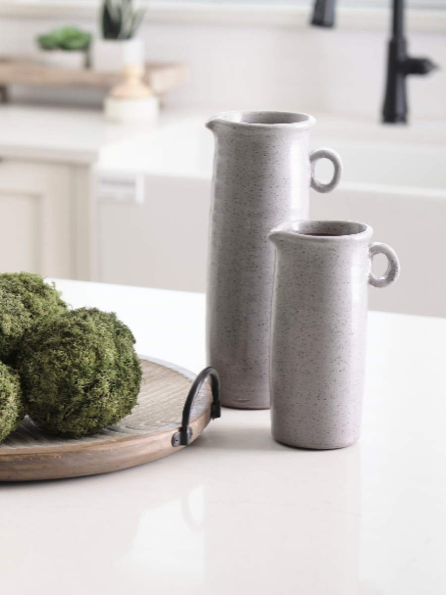 Le pichet Frieda est un magnifique accessoire en céramique, arborant un extérieur grisé parsemé de taches élégantes. Son design unique et sa texture apportent une touche artistique à votre décoration. Parfait pour servir des boissons ou comme pièce décorative, il s'intègre aisément dans tous les styles d'intérieur.